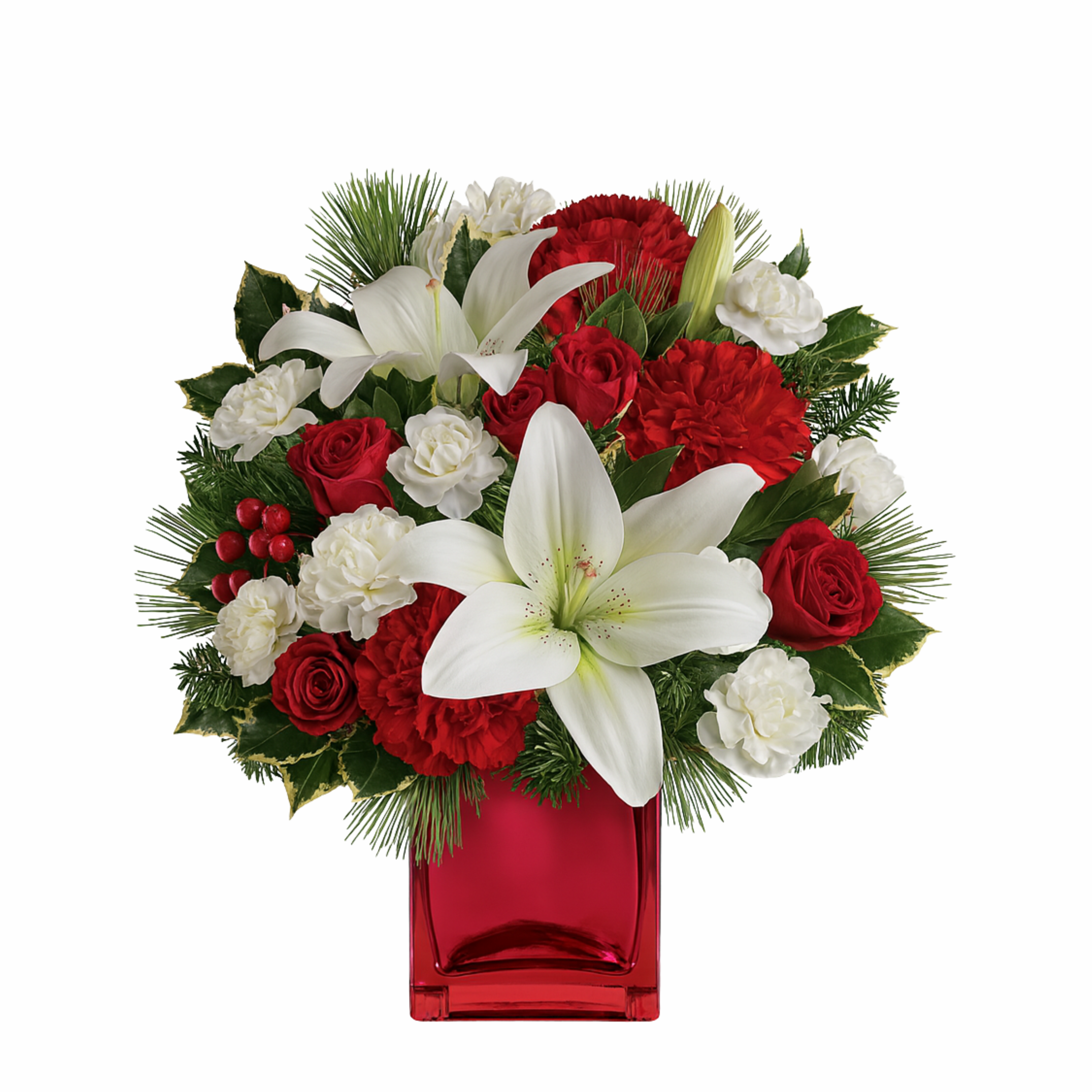 This festive, affordable holiday bouquet features red roses and white Asiatic lilies presented in a red cube vase, accented by tips of white pine, noble fir, and holly.