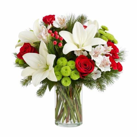 Red roses and white lilies are a wonderful surprise any time of year. Make an impression with our spectacular arrangement of lilies, roses, alstroemeria, daisies assorted with greens, designed in a stylish glass vase.