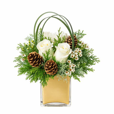 Take home a magical sleigh ride this holiday season with this stunning arrangement available with Rideau Florist! White roses and Waxflower are presented beautifully in a glass vase.