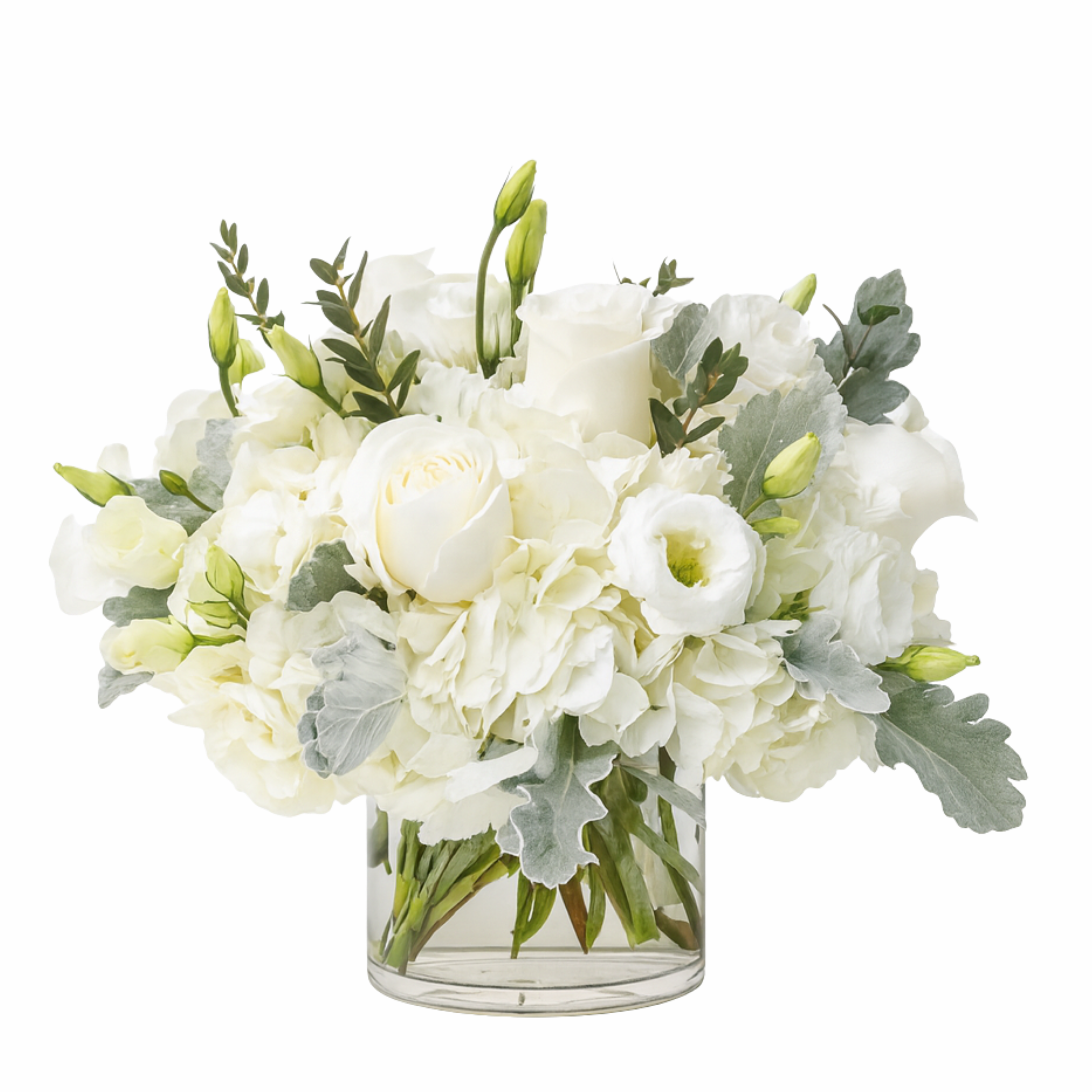 The elegant and stylish all-white flower arrangement is an undeniable symbol of respect, appreciation, and, of course, love.