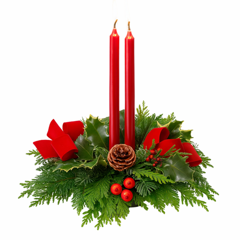 • Decorated with pinecones, ornaments and elegant 12"L taper candles and topped with a velvet ribbon